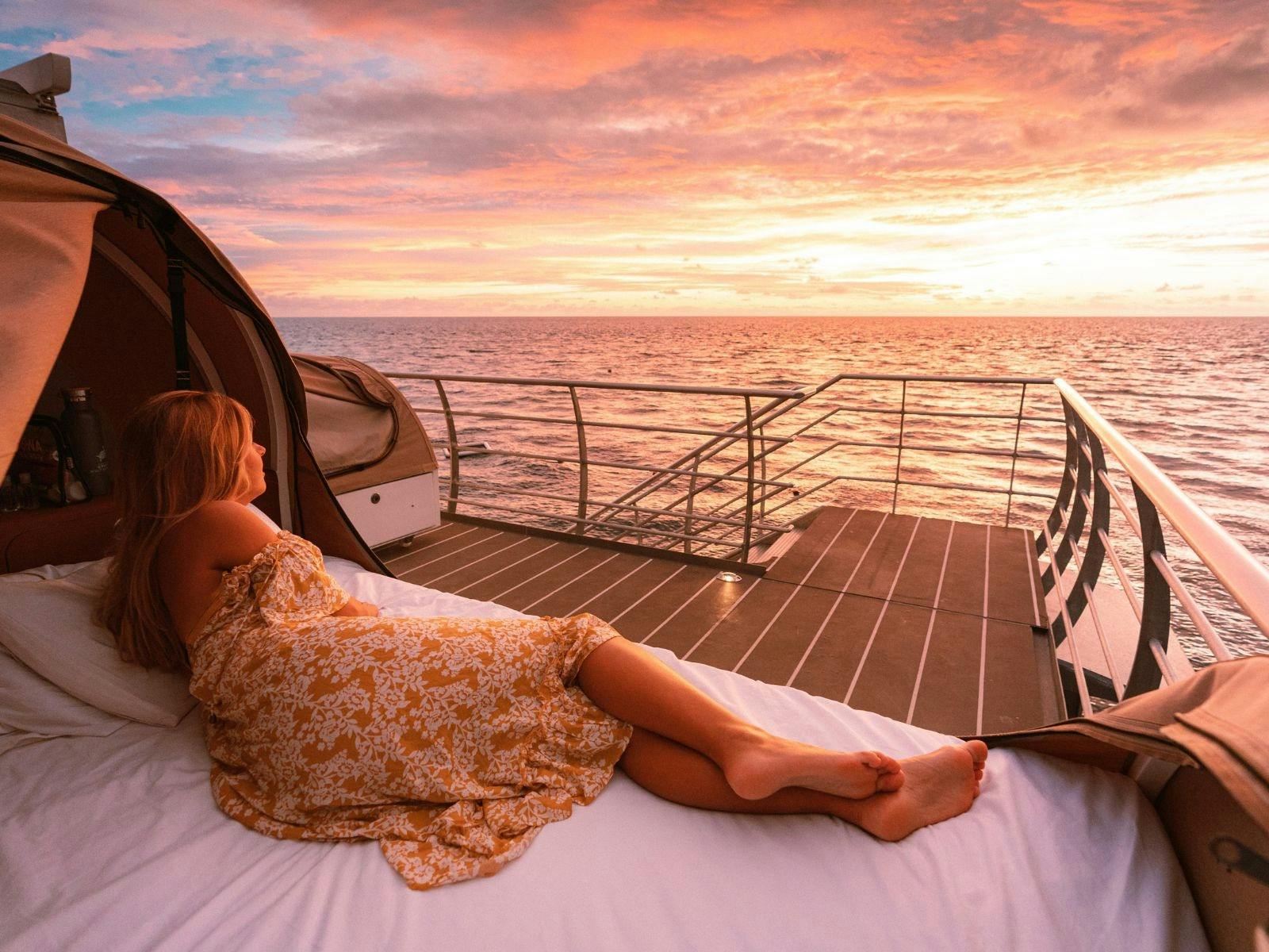 Cruise Whitsundays’ Reefsleep experience is an unforgettable and inherently romantic honeymoon idea. Couples spend two days and one night aboard a floating pontoon on Hardy Reef, part of the Great Barrier Reef, arriving after a scenic cruise through the Whitsunday Islands and enjoying snorkelling, swimming and reef exploration together by day. Once day trippers depart, the reef becomes your private world as you watch the sun set over the ocean, share a cocktail, then sleep under a blanket of stars in a cosy reef bed on deck, the sound of waves and a galaxy above creating an intimate, once-in-a-lifetime experience for newlyweds to cherish forever.